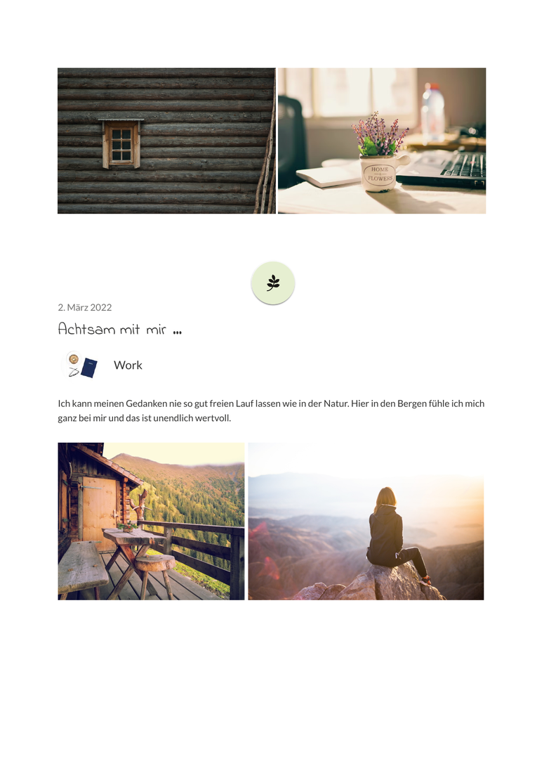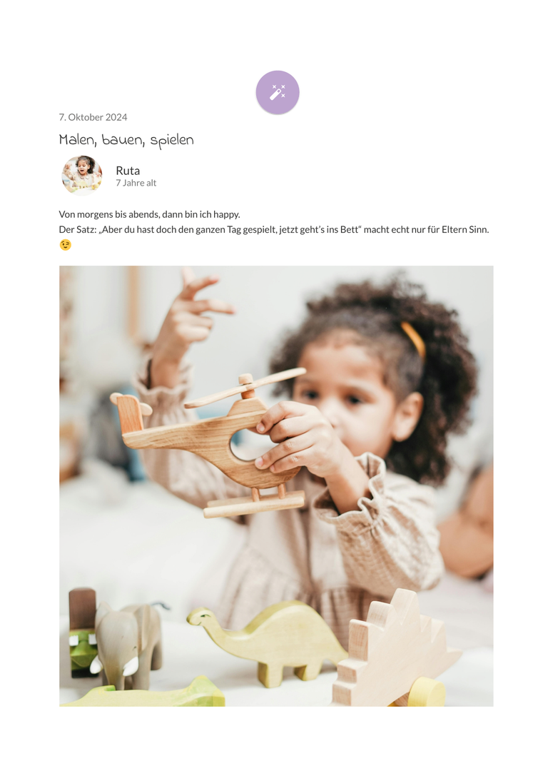 - Das eBook-Layout ist optisch an dein Online-Tagebuch angelehnt. Wir platzieren für dich Datum, Überschrift, Tagebucheinträge, Fotos, Sticker & Avatare - du brauchst nichts weiter tun.